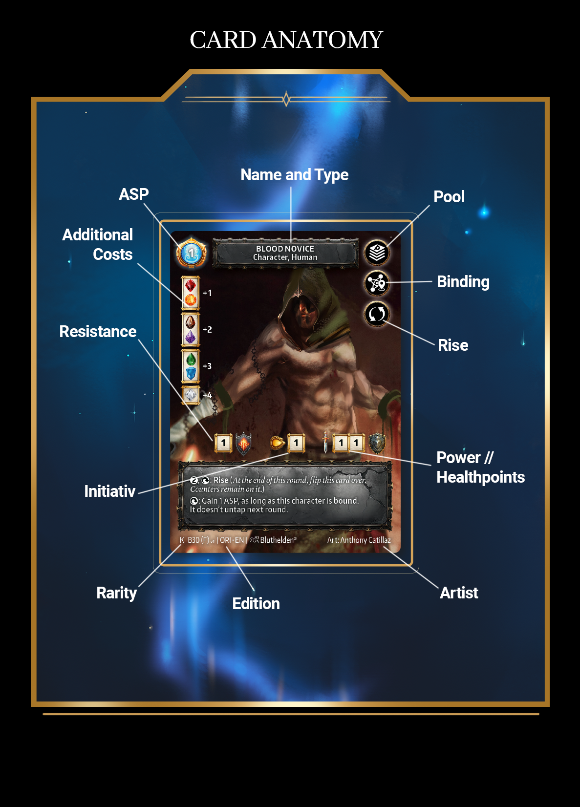 Die abgebildete Karte, der "Blood Novice", ist eine von wenigen Karten, die alle Symbole und Fähigkeiten besitzt.