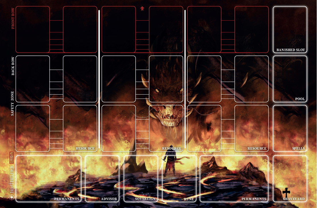 Es gibt verschiedene Zonen, die Du bespielen kannst. In Deiner eigenen Schutzzone baust Du Deine Ressourcen und somit Deiner Herrschaft aus. Die vordere Zone ist die Kampfzone, die in 3 Teilzonen aufgeteilt ist.