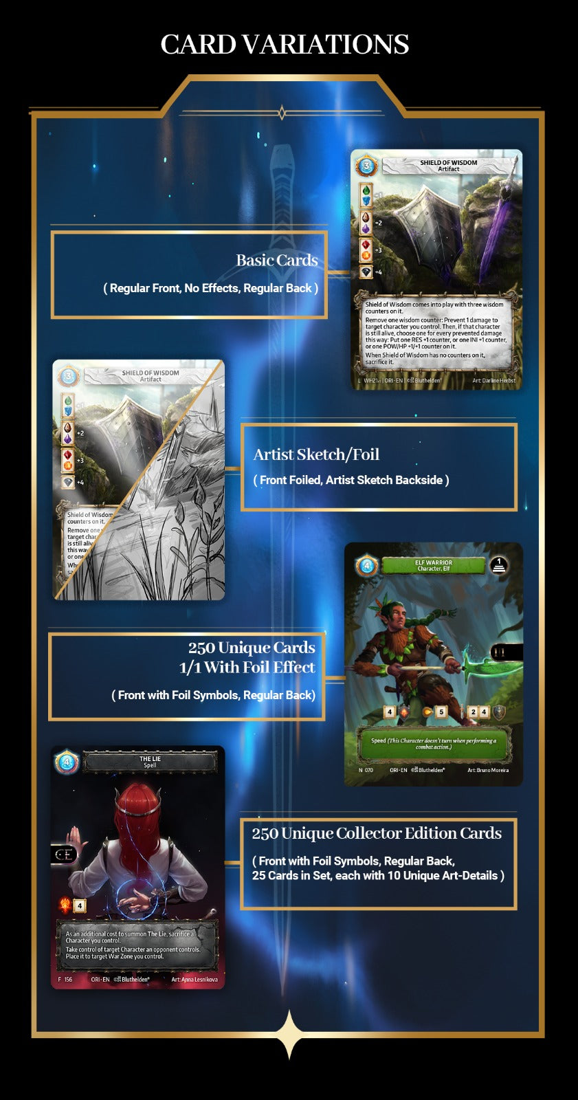 In "Origin" wird es vier verschiedene Druckversionen der Karten geben. Basic Cards, Artist Sketch/Foil, 250 1/1 mit Foil Effekt und 250 einzigartice Collector Edition Cards.